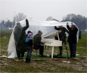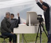 al campamento de Idomeni un piano blanco que dispuso en mitad del barro,