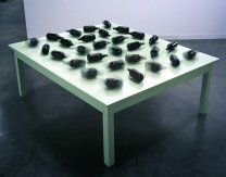 presentaba en la Galería Mejicana OMR una mesa de botellas de
