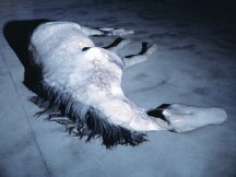 de un caballo de color crema muerto tirado en el suelo, extremadamente