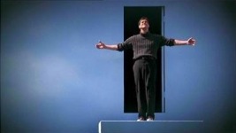 asciende hasta una puerta de salida. Cuando está a punto de atravesarla,